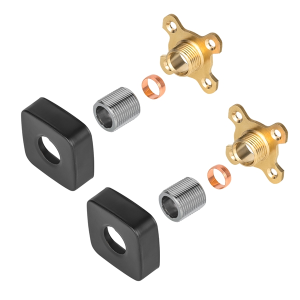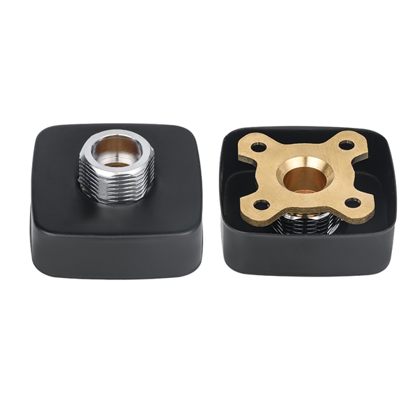 Fekete, négyzet alakú zuhanycsaptelep. Fő célja, hogy stabil, lapos és könnyen szerelhető alapot biztosítson a falra szerelhető csaptelepekhez. A termék a sárgaréz és a szénacél összetett szerkezetét alkalmazza: a faljal és a csaptelepekkel közvetlenül érintkező kulcsfontosságú erő- és csatlakozási részek sárgarézből állnak a hosszú távú korrózióállóság és a csatlakozás tömítettségének biztosítása érdekében; A lemeztest fő tartószerkezetként nagy szilárdságú szénacélból készül, amely biztosítja az egészhez a szükséges támasztómerevséget és megakadályozza a hosszan tartó igénybevétel miatti deformációt. A lemeztest felülete galvanizálással és más eljárásokkal kezelt, aranyszínű megjelenésű és könnyen tisztítható. Szabványos négyzetnek tervezték, előre beállított beépítési furattal, hogy illeszkedjen a szokásos csaptelep-tartozékokhoz és egyszerűsítse a telepítési folyamatot.