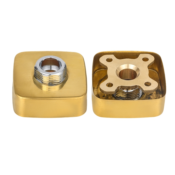 Arany négyzet alakú zuhanycsaptelep. Fő célja, hogy masszív, lapos és könnyen szerelhető alapot biztosítson a falra szerelhető csaptelepekhez. A termék a sárgaréz és a szénacél összetett szerkezetét alkalmazza: a faljal és a csaptelepekkel közvetlenül érintkező kulcsfontosságú erő- és csatlakozási részek sárgarézből állnak a hosszú távú korrózióállóság és a csatlakozás tömítettségének biztosítása érdekében; A lemeztest fő tartószerkezetként nagy szilárdságú szénacélból készül, amely biztosítja az egészhez a szükséges támasztómerevséget és megakadályozza a hosszan tartó igénybevétel miatti deformációt. A lemeztest felülete galvanizálással és más eljárásokkal kezelt, aranyszínű megjelenésű és könnyen tisztítható. Szabványos négyzetnek tervezték, előre beállított beépítési furattal, hogy illeszkedjen a szokásos csaptelep-tartozékokhoz és egyszerűsítse a telepítési folyamatot.